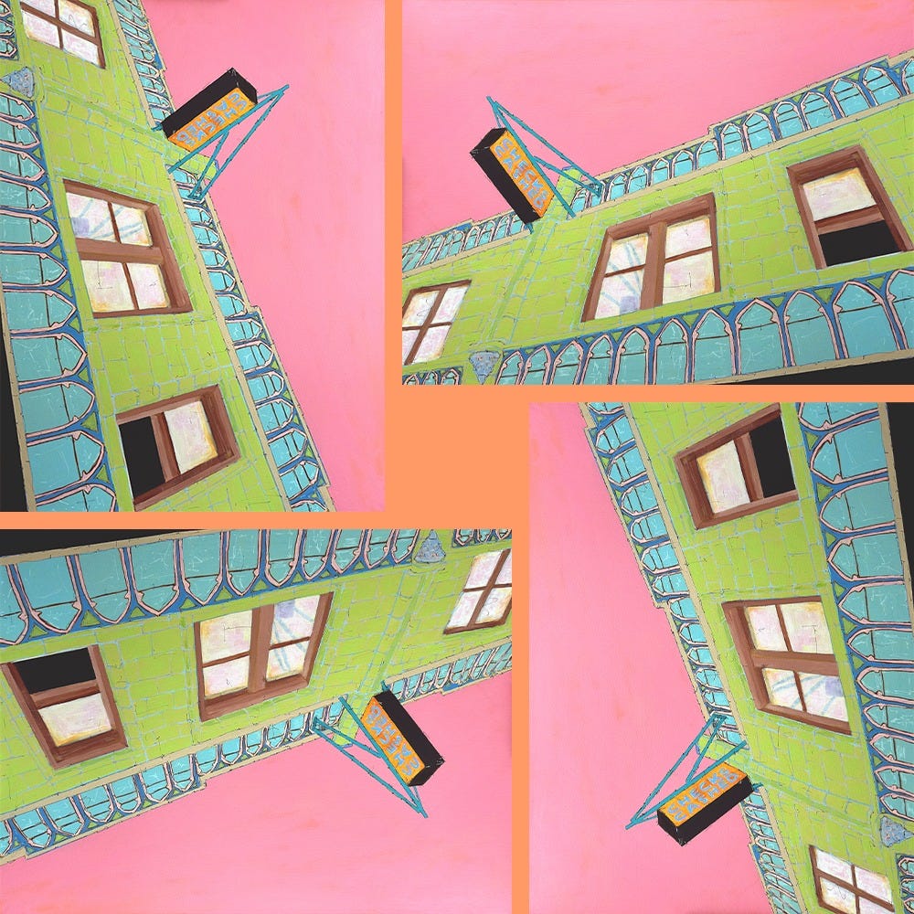 “Still Moving” is a painting that works in four orientations. Same corner, same architecture, same unreachable moment. Turned around until arrival becomes the subject. It is part of my new Inside-Out series, which is really about that threshold: the place where looking becomes longing.